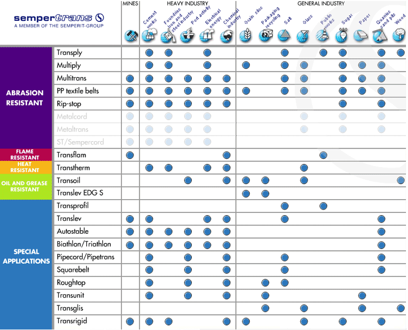 Transrigid Transglis Transunit Roughtop Squarebelt Pipercord / Pipertrans Biathlon / Triathlon Autostable Tranlev Transprofil Translev EDG S Transoil Transtherm Transflam Rip-stop PP textile belts Multitrans MultiplyTransplyTransply